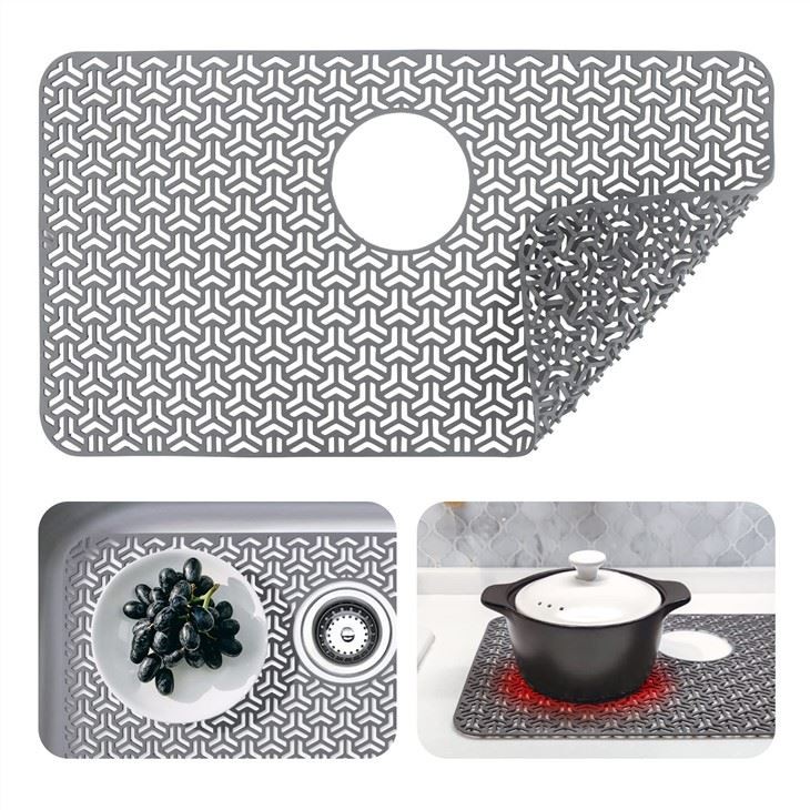 2. Tahan panas: Silikon tahan panas, sehingga Anda dapat menggunakan alas wastafel sebagai tatakan kaki tiga untuk melindungi permukaan meja dari panci dan wajan panas.