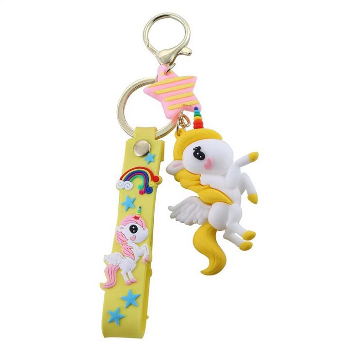 Gantungan kunci silikon terbuat dari proses silikon, lembut, elastis, dan tahan lama; polanya menyatu dengan gelang. Gantungan kunci ransel untuk anak perempuan memiliki elastisitas tertentu, dan bentuk timbul dari unicorn warna-warni sangat jelas dan halus.