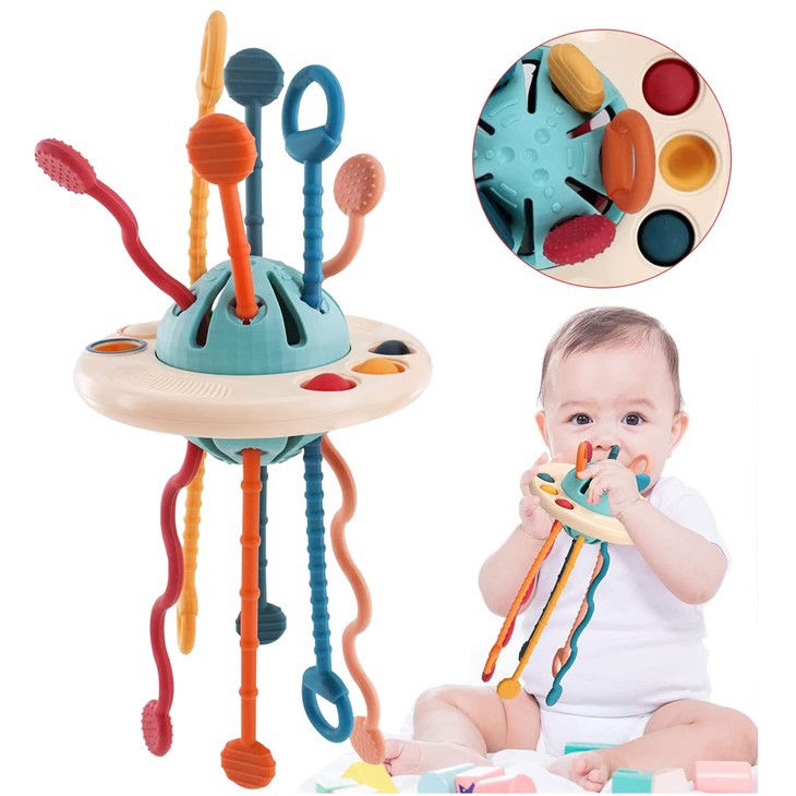 Warna-warna cerah digunakan dalam mainan menarik silikon ufo montessori untuk merangsang pertumbuhan visual bayi. Bentuk pesawat memudahkan bayi untuk menggenggam dan memegang, mendengar dan mengalami berbagai suara dan getaran, dan menarik kabel dari satu sisi ke sisi lainnya. Kemampuan motorik, eksplorasi sensorik, keterampilan motorik halus, dan koordinasi tangan-mata semuanya didorong dengan menggunakan tali dan pegangan bertekstur.